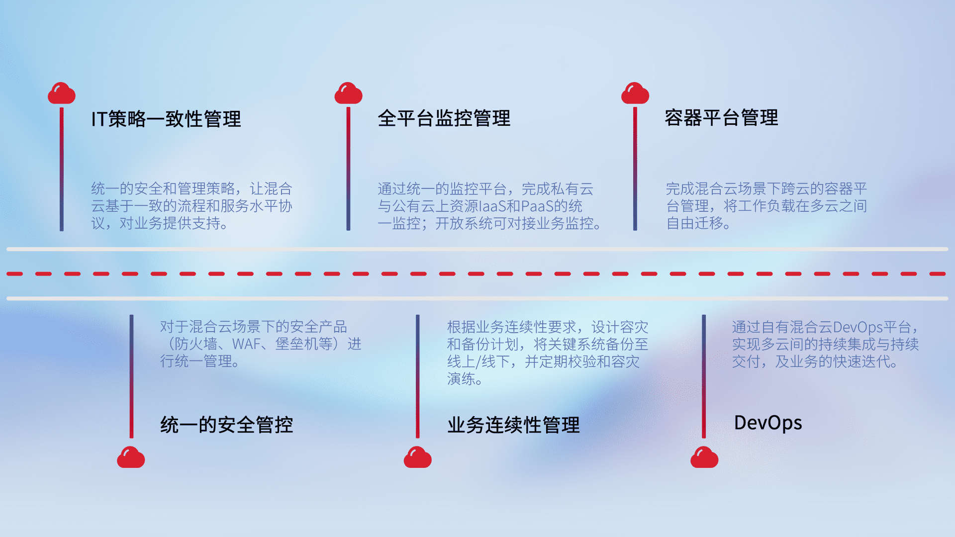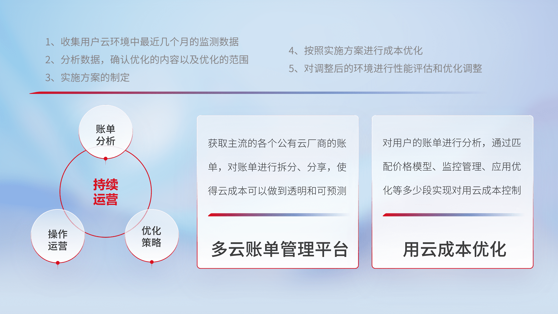 通过多云纳管,,,以统一的资源数据模型把客户的云资源进行抽象和封装,,进而实现对多云资源的统一操作,,,保障云资源管理的可靠性、、稳定性与可用性。。。。量身定制化运维内容,,配置、、开发运维、、、、补丁管理、、、、备份、、监控、、、认证和访问管理、、审计和日常巡检等,,保障在用云过程中的可靠度,,稳定度以及高可用率。。。。