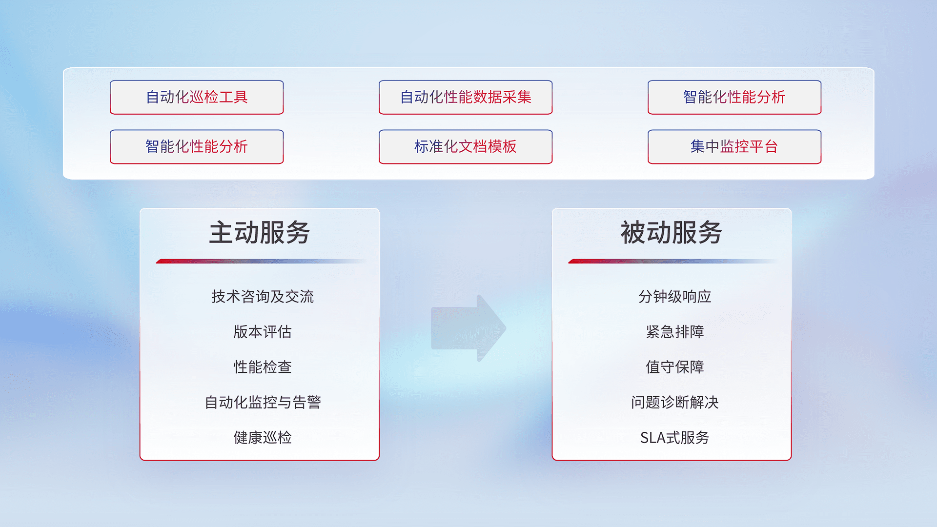 智能化工具和标准化文档,,保障服务质量,,,,提供主动服务(包含技术咨询、、、、版本评估、、、、性能检查、、、自动化监控与告警、、健康巡检)和被动服务包含(分钟级响应、、、紧急排障、、、、值守保障、、问题诊断解决、、SLA服务)。。